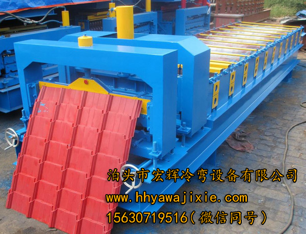 860型琉璃瓦設備主要由放料機、進料導入平臺、成型主機、沖模壓型裝置、成型剪切裝置、液壓站、電腦控制系統(tǒng)、成品托架等幾部分組成。